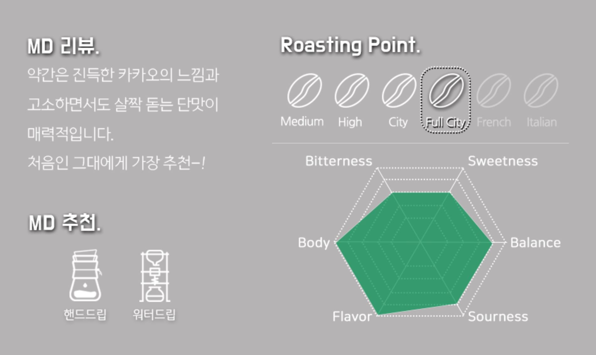 밸런스가 좋으며, 고소하고 묵직한 여운이 오래남는 원두커피